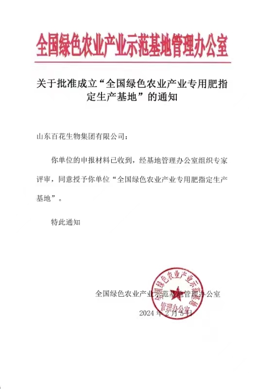 山东百花生物集团荣获“全国绿色农业产业专用肥指定生产基地”殊荣
